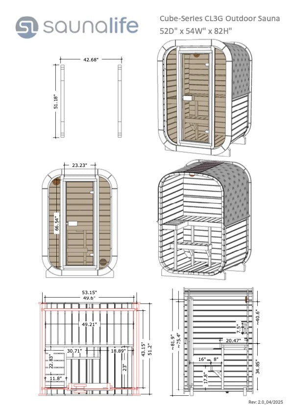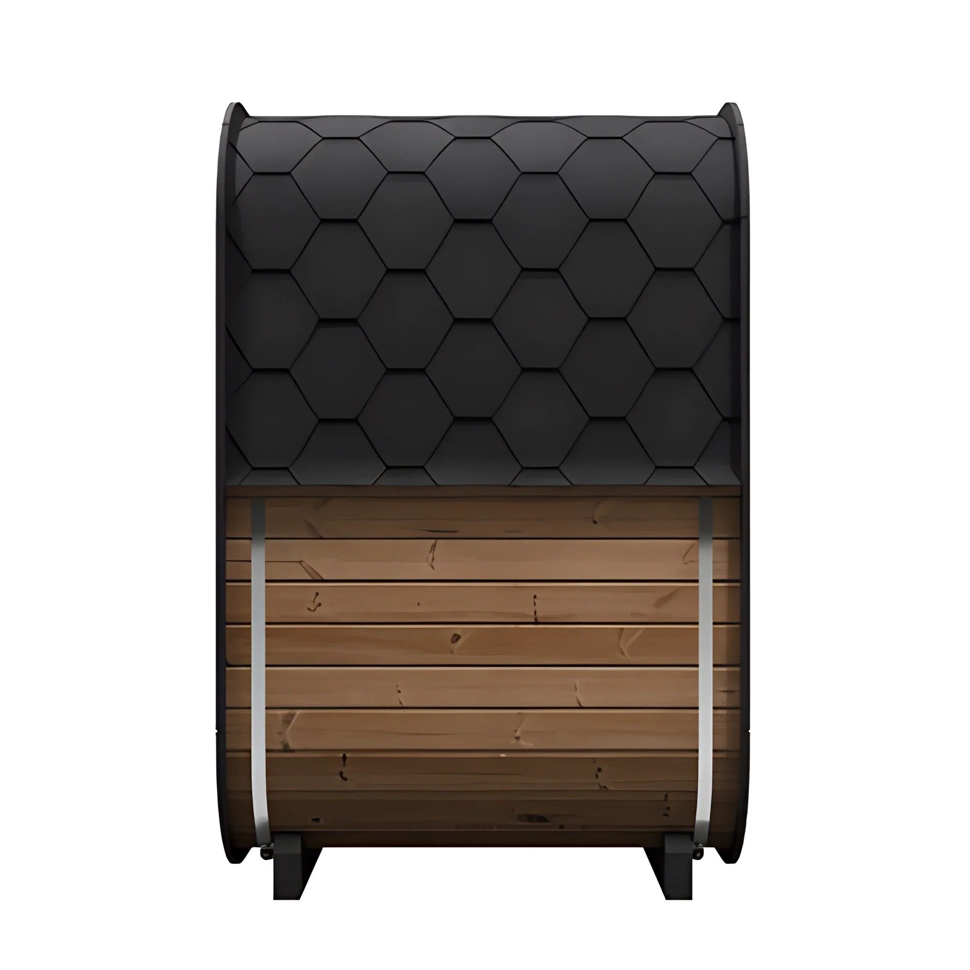 Premium quality materials are evident everywhere on Cube-Series Saunas. The exterior wood is made from durable full-length staves that have been organically thermally enhanced. This Thermo-Spruce wood is stronger, more dimensionally stable, naturally resists decay and pests, and will far outlast conventional wood. A complete shingle kit with drip rails ensures superior water management and a dry interior. The bronze-tinted 8mm thick front door is both beautiful and tempered for your safety.